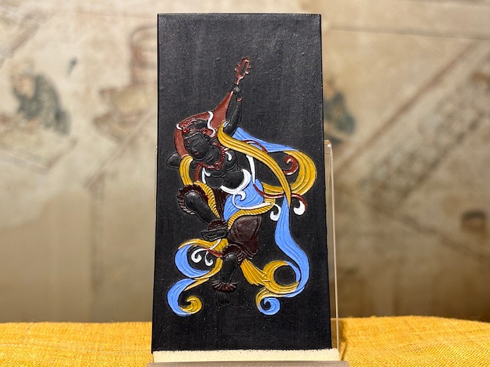 反弾琵琶舞 「敦煌」莫高窟一一二窟の壁画の一部(李振甫 模反弾琵琶舞)を模して高級菜種油煙を使い製作いたしました。反弾琵琶舞は中唐の頃(七八一〜八四八年)の作とされます。舞伎は宝冠をつけ、上半身を裸にし、胸飾り、腕輪、足輪をつけています。腰に帯をしめ、琵琶を頭の後ろで弾じながら(反弾琵琶)、足を踏みあげ舞い踊る図です。