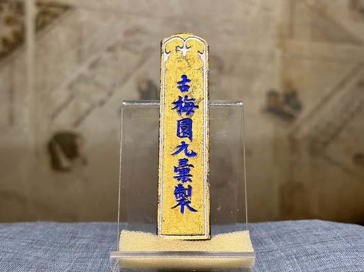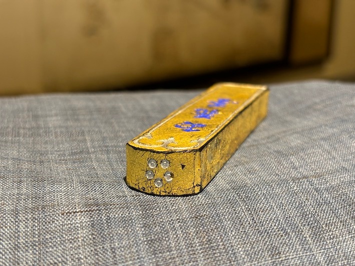 生金巻き 漆墨 紅花墨は菜種油を使った最も粒子の細かい最高級の油煙の漆墨を古梅園製墨の代名詞、紅花墨の形に入れて作られた珍しい御墨です。