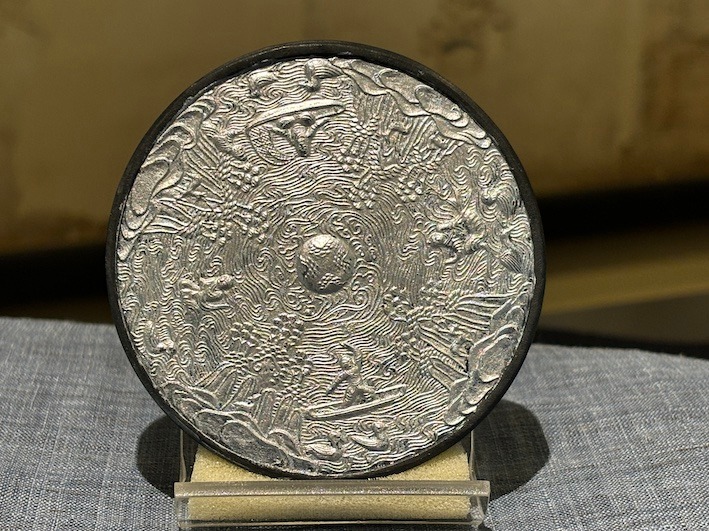 山水人物鳥獸背圓鏡は美しい山水文様や船に乗る人物、山に生きる鹿や水面に遊ぶ水鳥といった現代と変わらぬ自然をモチーフに文様が彫られた鏡です。