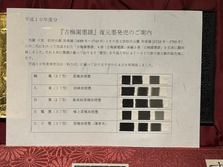 鶴亀 3.0丁型 菜種油煙墨 金巻、孔雀 1.0丁型 胡麻油煙墨 金巻 、貝葉 2.0丁型 最高級菜種油煙墨、古璽墨 3.0丁型 極上菜種油煙墨、九子墨 3.0丁型 菜種油煙墨(薄青系)