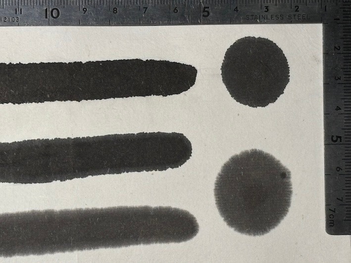 本日は、楽寿のご紹介です。楽寿は菜種油を使った油煙墨で、伸びが良く、かな用に最も適しています。濃墨は純黒、淡墨は茶系の黒です。漢字、仮名作品、写経等に最適です。