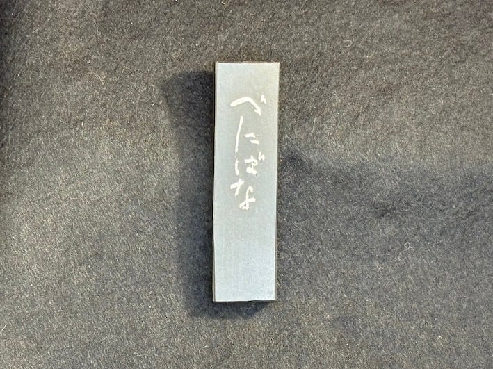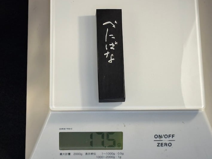 <品 名> べにばな (紅入り) <特 徴> 極上油煙墨(紅入り) 菜種油を使った油煙に山形産の「べにばな」から抽出した本紅を入れたものです墨は黒いものですがその中に紅を入れることに依り黒さが非常に引き立ちます。 <大きさ> 1.0丁形 高さ 約76mm 幅 約20mm 厚み 約9mm 重さ 約20g