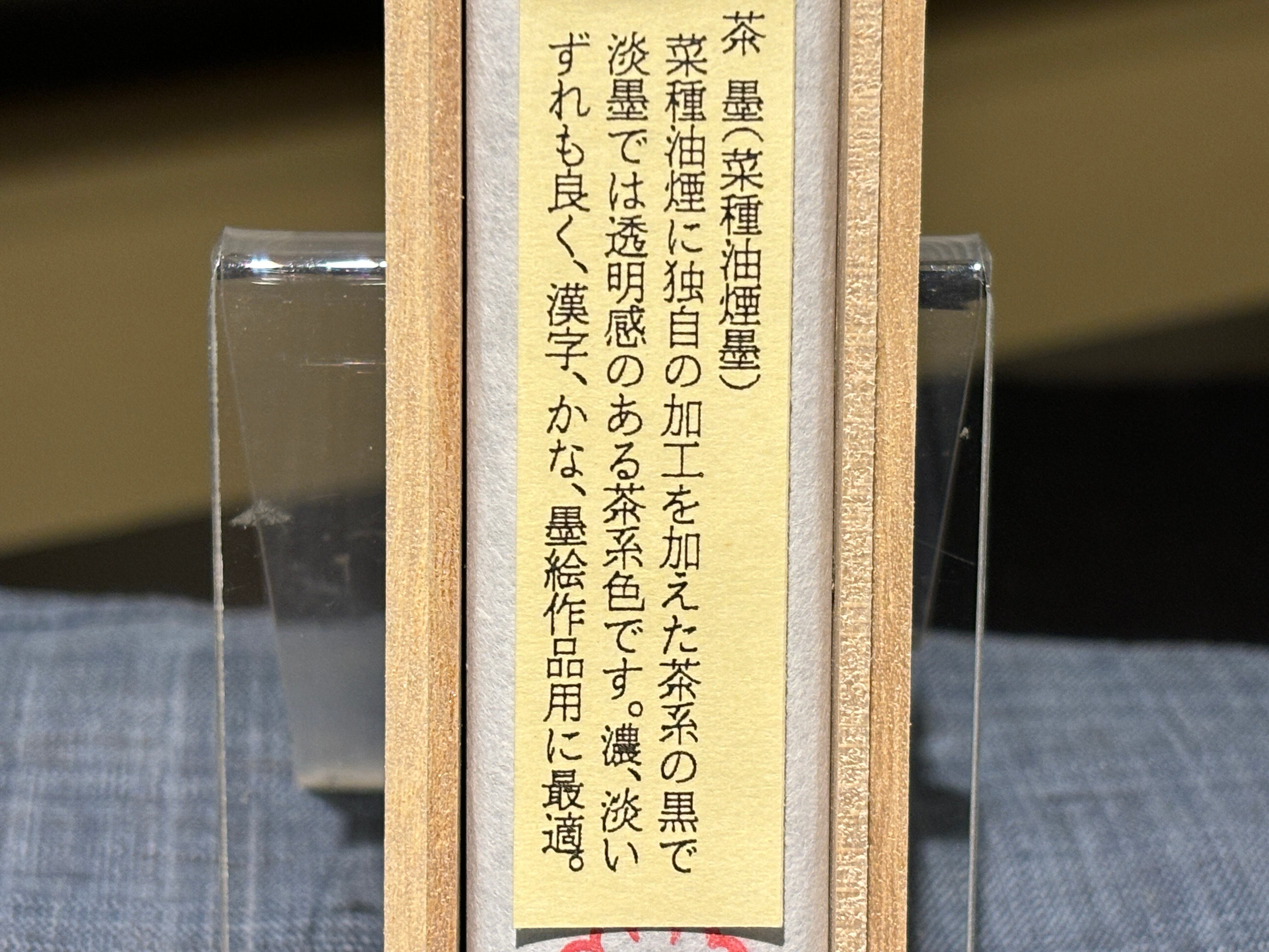 <商品名> 茶墨 百石公子 (菜種油煙墨) <特 徴>菜種油煙墨に独自に加工を加えた茶系の黒で淡墨では透明感のある茶系色です。濃、淡いずれも良く、漢字、かな、墨絵作品用に最適。 <大きさ> 1.5丁型 高さ 約91mm 幅 約24mm 厚み 約9mm 重さ 約20g