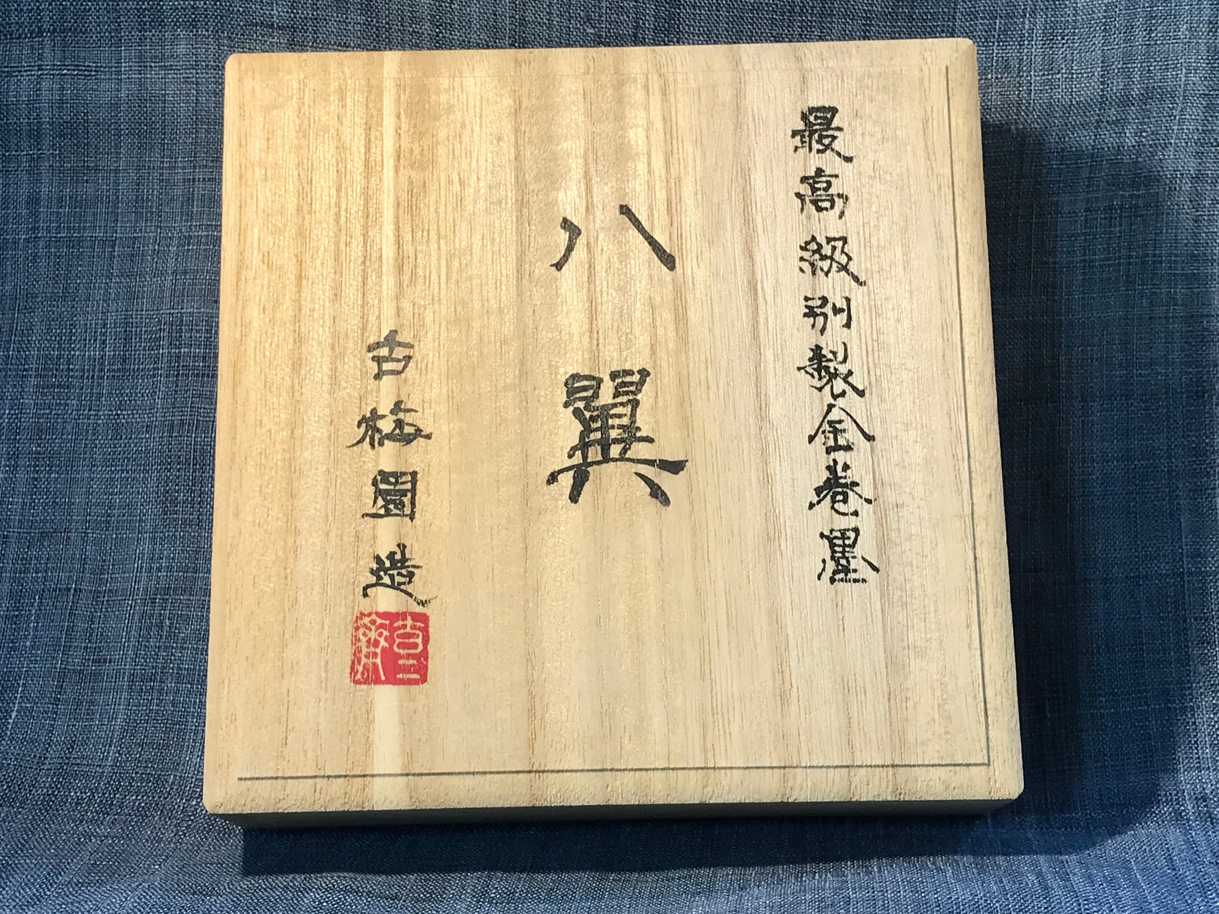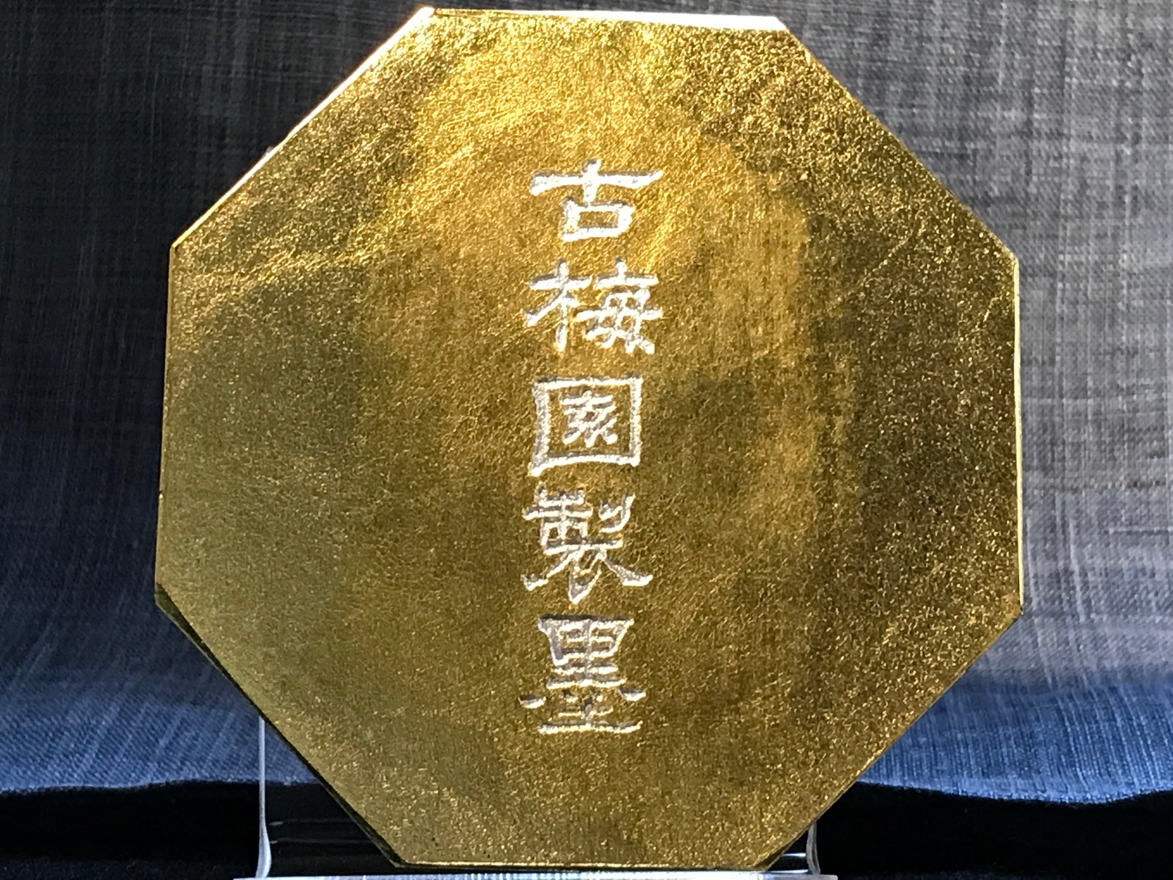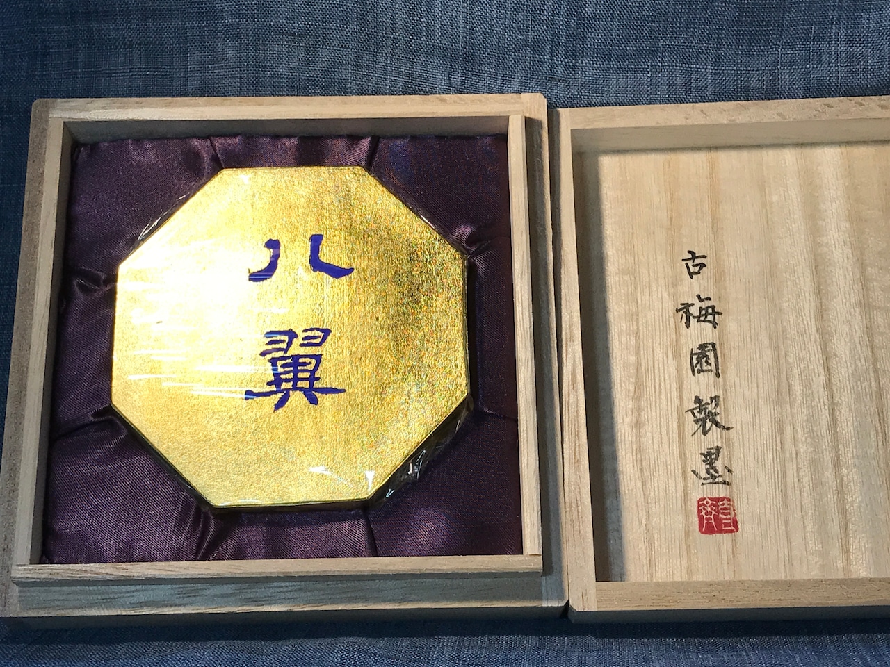 <特 徴> 菜種油を使った最も粒子の細かい最高級の油煙に金箔を貼りました。濃墨ですと艶のある純黒で、淡墨は茶色系の黒です。のびが良く、漢字、仮名作品に最適