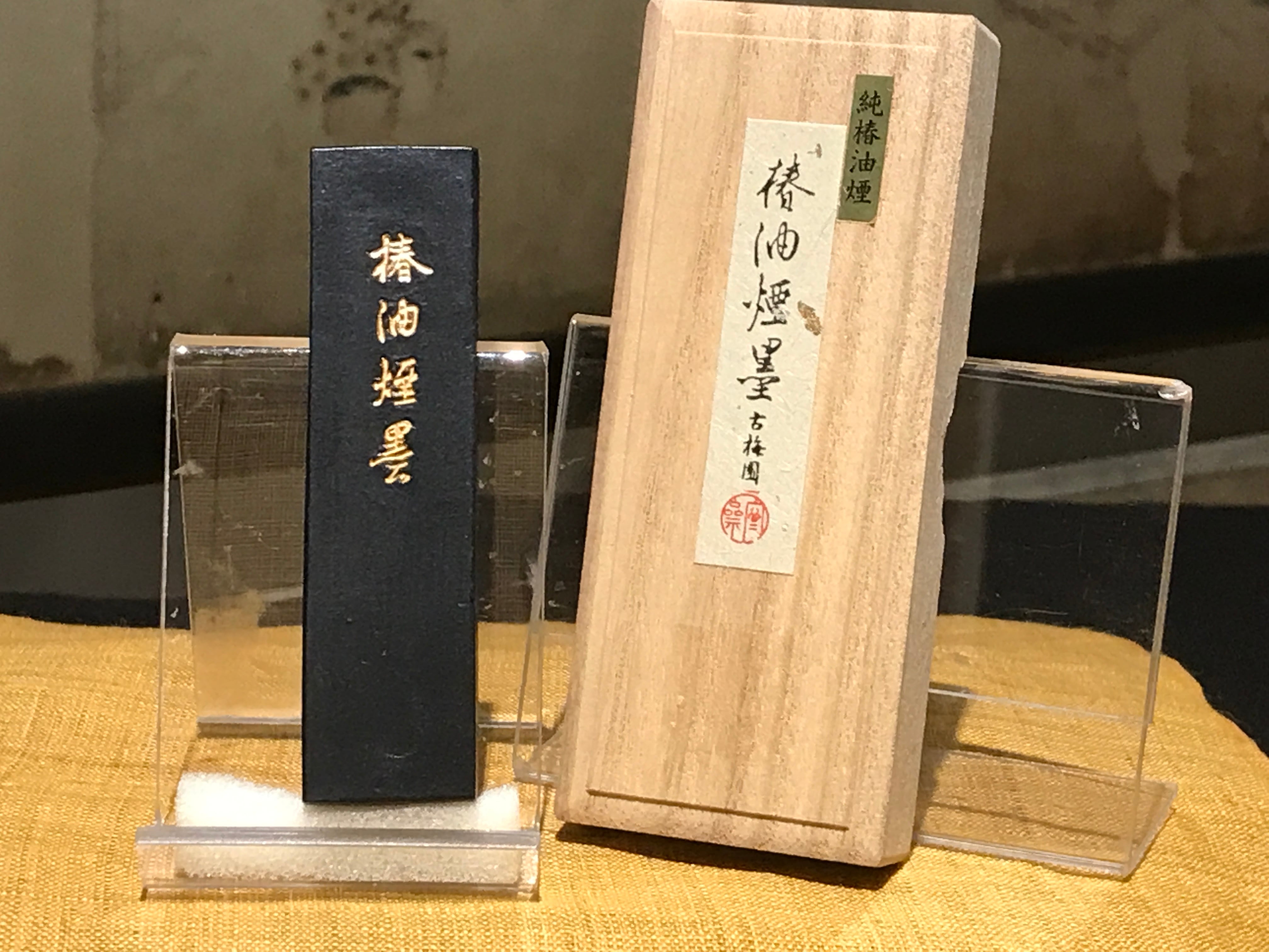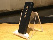 純、椿油煙だけを使って造った墨で、非常に伸びが良く、濃墨では深みのある純墨で、淡墨では紫系の黒です。紙にのせますと、あまり艶がなく、仮名漢字共に良いと思われます。